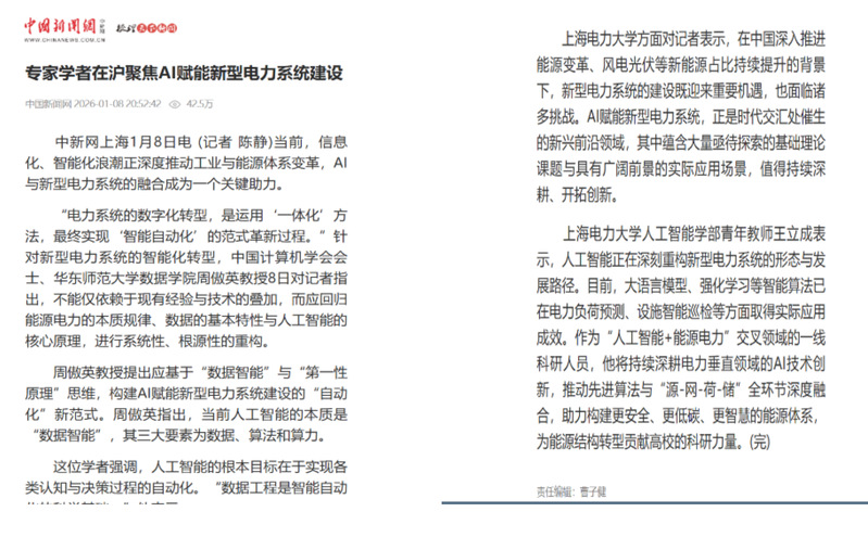 中新网、上海科技报等多家主流媒体集中报道我校AI赋能新型电力系统建设创新论坛