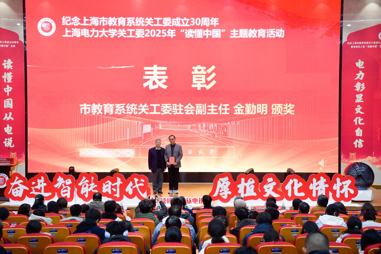 金勤明宣布授予上海电力大学关工委“2025年上海市教育系统关心下一代工作先进集体”称号,授予上海电力大学关工委副秘书长龙根勇同志“上海市教育系统关工委先进个人”称号,并为受表彰个人颁奖,勉励其再接再厉发挥示范引领作用,续写关心下一代事业新辉煌。