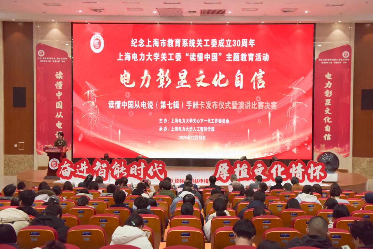 12月16日下午,由校关工委主办、人工智能学部承办的“读懂中国从电说·电力彰显文化自信”手账卡(第七辑)发布暨演讲比赛决赛在临港校区学术楼117会议室举办。市教卫工作党委老干部处处长、教育系统关工委秘书长于美华,市教育系统关工委驻会副主任金勤明,校党委书记、关工委主任宋来,校党委副书记、副校长、关工委执行主任朱克勇,校关工委常务副主任石奇光,校关工委副主任韦钢,校党委组织部部长赵建明,校党委宣传部部长石笑寒,校退休党委书记、关工委秘书长徐广新,校学工部部长、校关工委副秘书长陈姗姗,人工智能学部党委书记、关工委主任刘莉以及校团委、校关工委老同志代表、各二级学院党委副书记、教师代表和学生代表等三百余人参加,活动分为手账卡发布启动仪式和演讲比赛决赛。手账卡发布启动仪式由人工智能学部副书记齐永晓主持。
