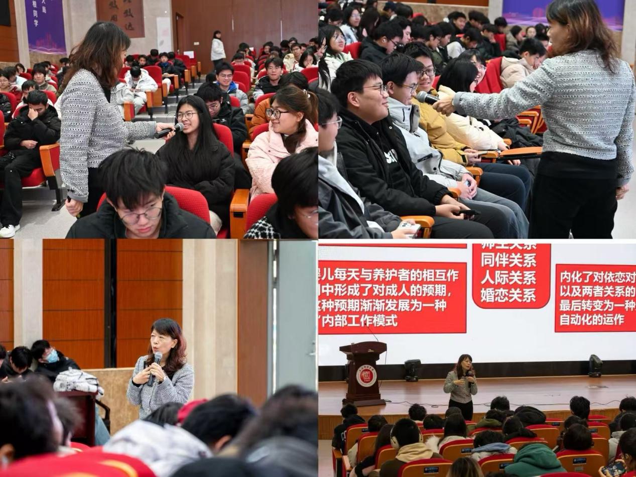 作为拥有丰富心理健康教育工作经验的心理咨询师,蔡雅琦博士围绕爱情的科学认知、生命早期亲密关系的影响、亲密关系中的依赖平衡以及爱与成长的辩证关系等核心内容,蔡雅琦博士展开深入阐释。她用贴近校园生活的案例、专业又易懂的讲解,为学生解开了人际关系中的诸多困惑,使学生明白如何用真诚与尊重搭建社交桥梁,如何用理性与包容化解矛盾,从树立“以爱为名、相互成长”的恋爱观,到坚守情感中的自我边界与底线,每一个知识点都干货满满,帮助同学们以更理性的视角看待情感,在与人相处中学会成长,在爱与被爱中成就更好的自己。同学们纷纷表示,通过此次讲座,不仅系统了解了心理健康相关知识,更深刻认识到亲密关系与自身价值的内在联系,学会了如何在情感中保持自我、实现成长,心理韧性与综合素质得到进一步提升。以“什么是爱情”这一贴近青年学生的话题为切入点,用幽默鲜活的现实案例拆解亲密关系的本质。讲座中,她打破传统授课模式,多次走下讲台与同学们互动交流,认真倾听大家对情感关系的困惑与思考,现场氛围热烈融洽。