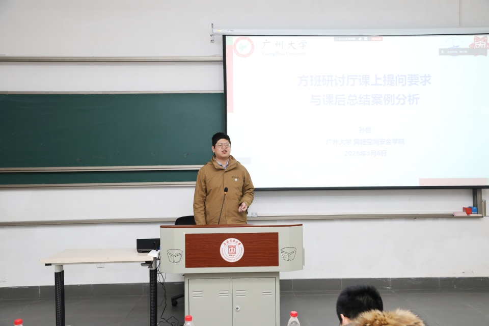 3月6日下午,活动同步举办方班模式专题报告,广州大学束建钢教授以《方班研讨厅课程介绍及演讲要求》为题,系统解读了方班研讨厅的课程体系设计、实施规范与核心育人目标;广州大学孙哲教授围绕《课上提问和课后总结》,分享了方班翻转课堂教学模式中的互动设计、思维引导与教学闭环构建方法;广州大学吴联仁教授以《论文选题及案例分析》为主题,结合丰富的学术案例,讲解了网络安全领域学术研究的选题逻辑、创新路径与核心方法论。专题分享结束后,全体师生围绕方班教学模式落地、学术研究能力提升、学科建设融合等话题展开了充分的互动交流,为教学实践与人才培养工作积累了宝贵经验。